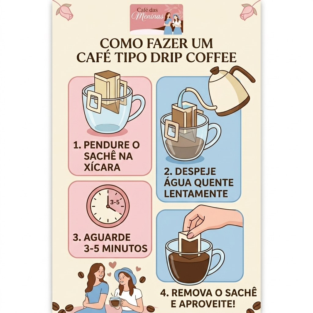 • Como preparar: 1. Abra o sachê na linha pontilhada. 2. Encaixe as alças na sua caneca. 3. Despeje água quente (aprox. 100ml a 150ml) lentamente. 4. Aprecie o seu momento Café das Meninas!